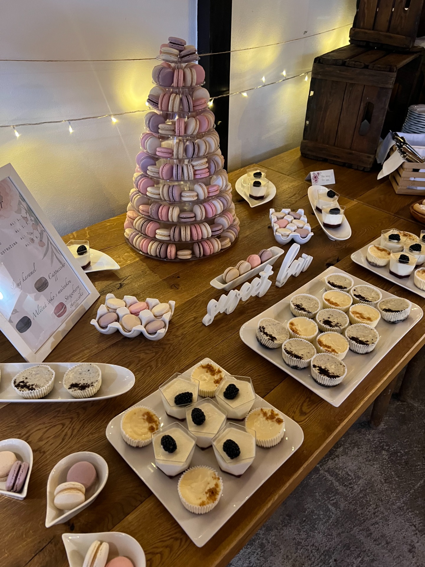 Rustikální svatební dort v seminaked variantě s dozdobením čerstvým ovocem a živými květy. Sweetbar byl ve složení - makronky (4 barvy, 4 příchutě), cheesecakes (2 příchutě), ostružinové panna cotty.